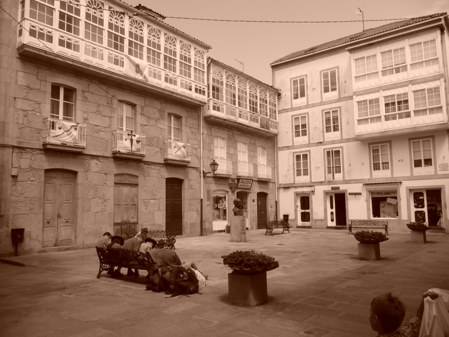 Erschöpfte Pilger auf dem Camino Portugues in Padron vor der letzten Etappe nach Santiago de Compostela